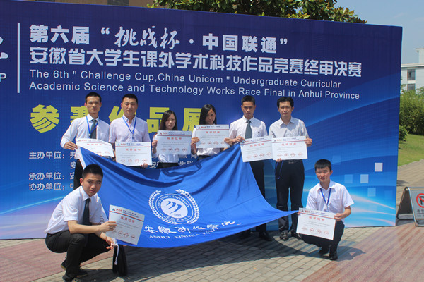 6月4日至6日,由共青團(tuán)安徽省委員會(huì)、安徽省教育廳、安徽科學(xué)技術(shù)協(xié)會(huì)、安徽省學(xué)生聯(lián)合會(huì)共同主辦的第六屆“挑戰(zhàn)杯”安徽省大學(xué)生課外學(xué)術(shù)科技作品競(jìng)賽終審決賽在安徽大學(xué)舉行,經(jīng)過激烈角逐,動(dòng)漫學(xué)院袁磊、馮灀、邢慧、阮從芳四位同學(xué)的作品《安徽省動(dòng)漫產(chǎn)業(yè)發(fā)展問題調(diào)查及研究對(duì)策》,土木與環(huán)境工程學(xué)院劉斌、周西好、石利軍、朱琳、張志剛五位同學(xué)的作品《基于漸縮型導(dǎo)流槽的汽車后視鏡雨眉系統(tǒng)》榮獲二等獎(jiǎng);商學(xué)院張玉倩、丁夢(mèng)爽、陳皖皖三位同學(xué)的作品《應(yīng)用型高校大學(xué)生兼職調(diào)查報(bào)告:基于應(yīng)用型人才的培養(yǎng)》,土木與環(huán)境工程學(xué)院房晴雨、曹路、嚴(yán)小丹、鄭敏、夏良辰五位同學(xué)的作品《公租房項(xiàng)目采用住宅產(chǎn)業(yè)化模式的技術(shù)經(jīng)濟(jì)分析》,文化與新聞傳播學(xué)院錢芳、陶海燕、陳小婷三位同學(xué)的作品《從傳播視角論新媒體對(duì)當(dāng)代大學(xué)生創(chuàng)新素質(zhì)的影響》,藥學(xué)院汪云霞、陸王明、呂來虎三位同學(xué)的作品《過碳酰胺種子包衣劑的配制及包衣研究》獲得三等獎(jiǎng)。本次大賽獲獎(jiǎng)的數(shù)量和級(jí)別均創(chuàng)歷史最好成績(jī)。