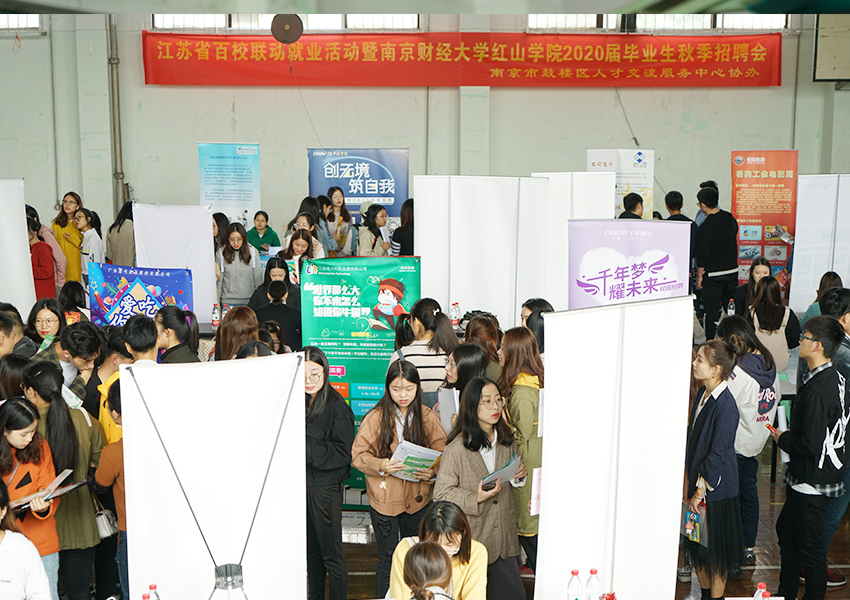 10月30日上午,江蘇省百校聯動就業活動暨南京財經大學紅山學院2020屆畢業生秋季招聘會在南京財經大學紅山學院福建路校區體育館舉行。途牛信息科技、招商銀行南京分行、南京蘇寧云財信息技術有限公司、浙商證券、南京萬得資訊等近百家用人單位現場招聘,涉及金融、財會、銷售、管理等多個崗位,基本涵蓋紅山學院全部專業。