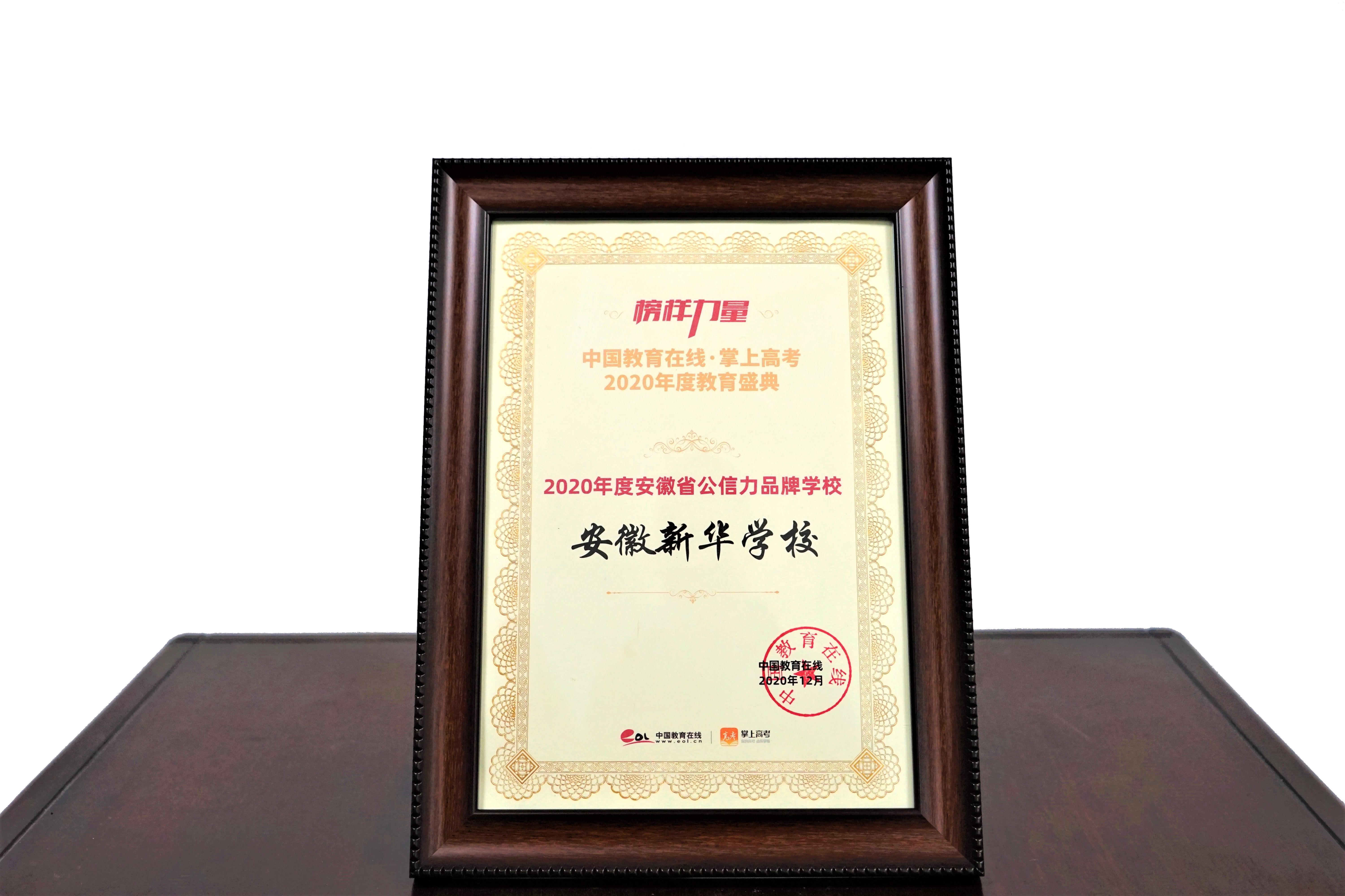 日前,榜樣力量·中國教育在線2020年度教育盛典評選結果公布,安徽新華學校榜上有名,榮膺“2020年度安徽省公信力品牌學校”稱號。